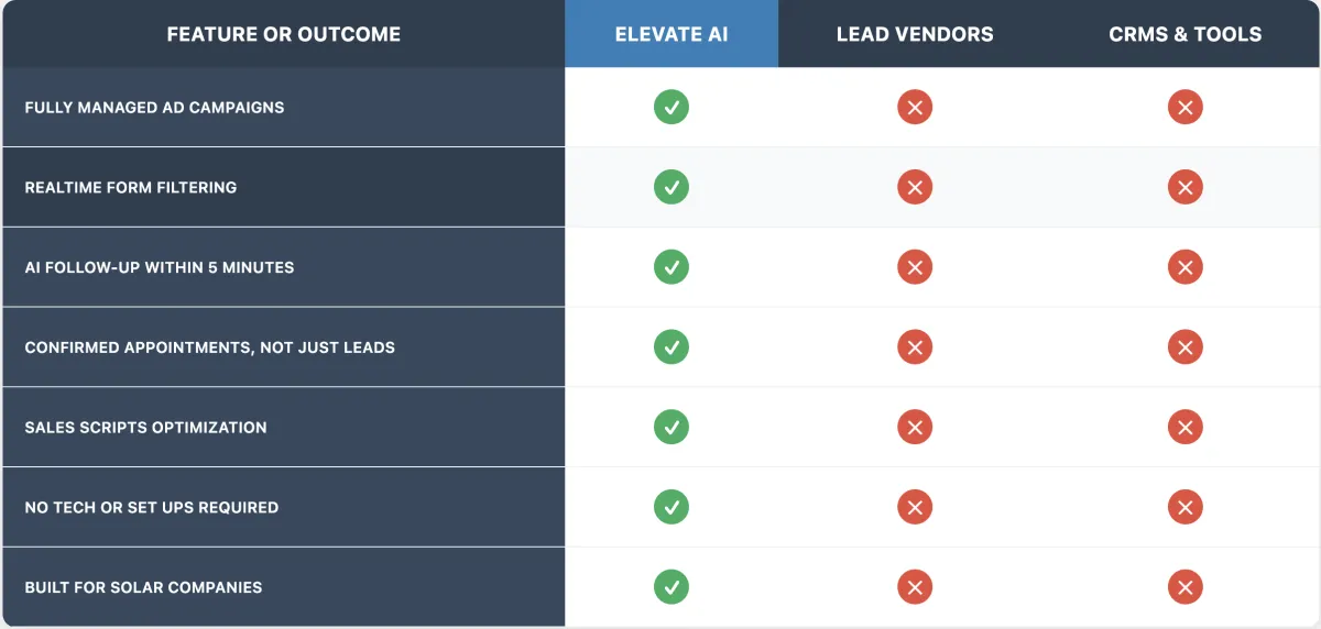 "Working with Elevate completely transformed our lead pipeline. Their AI not only helped us generate 300% more inbound leads, but it also qualified and nurtured them automatically. We used to chase cold lead. Now, we’re booking calls with pre-qualified homeowners ready to go solar. Our close rate jumped from 12% to 29% in under 90 days."